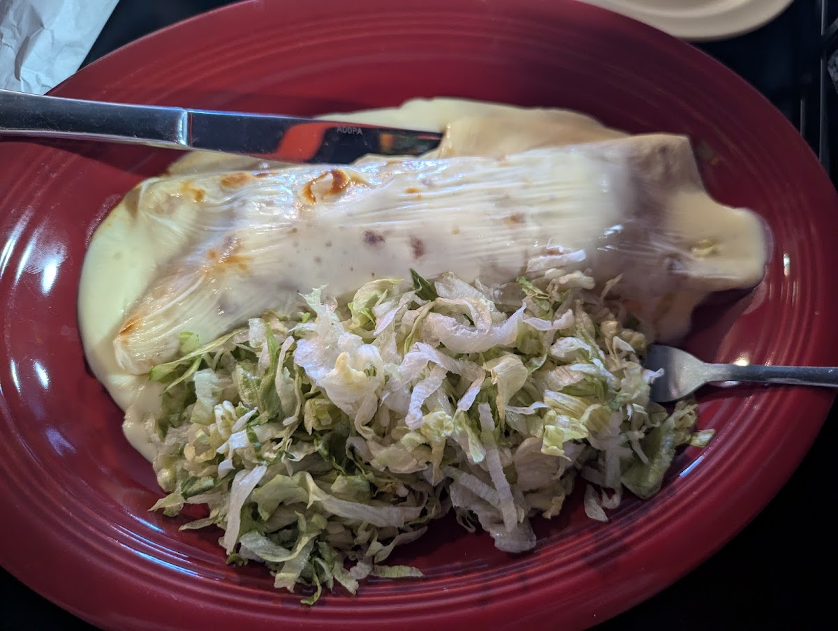 Vegetarian. Cheese enchilada topped with cheese dip, bean burrito with red sauce, and cheese quesadilla.